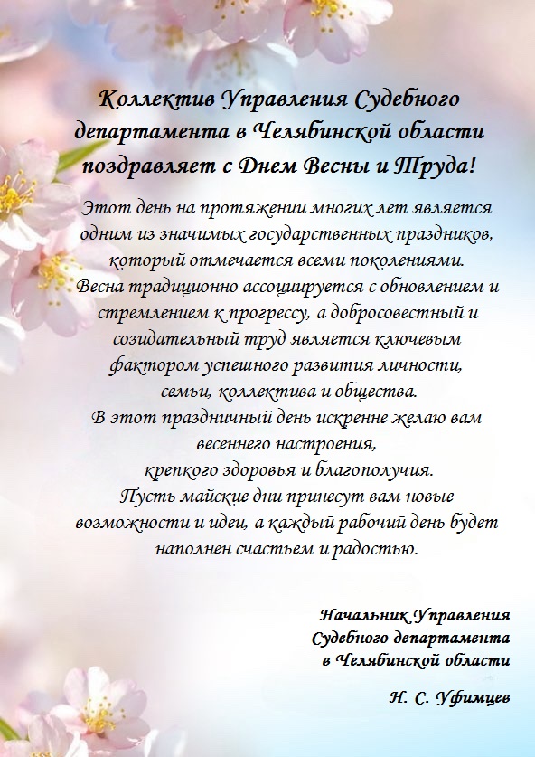 Коллектив Управления Судебного департамента в Челябинской области поздравляет с Днем Весны и Труда!