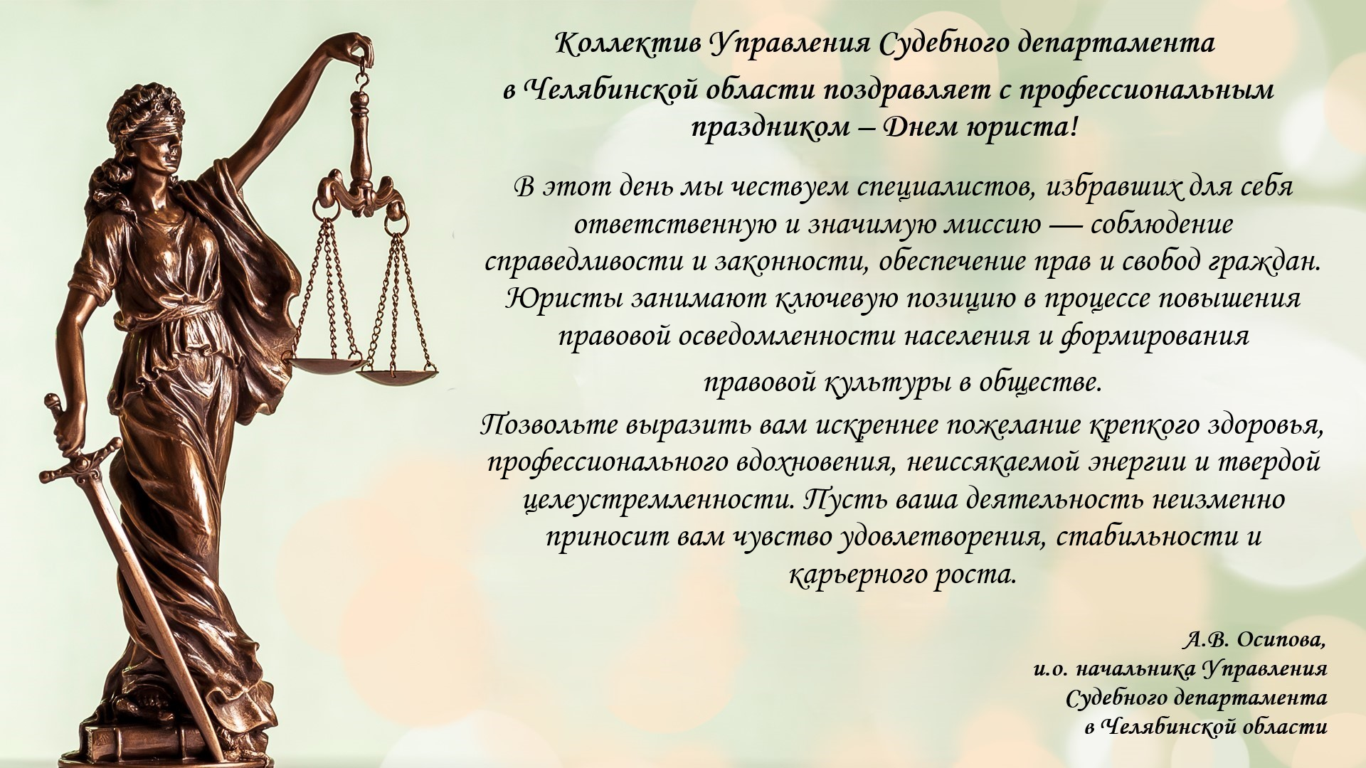 Коллектив Управления Судебного департамента в Челябинской области поздравляет с Днем Юриста!