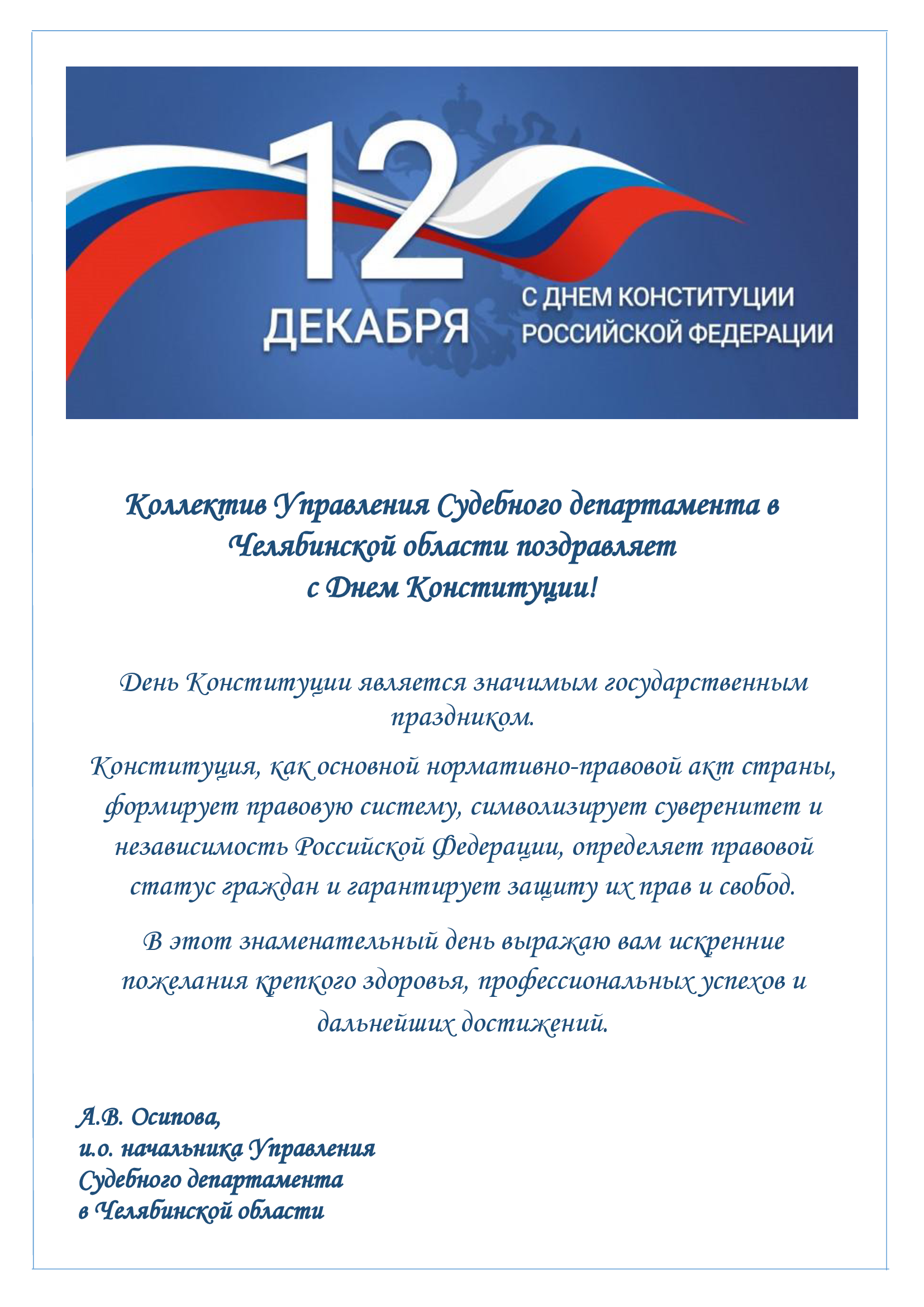 Коллектив Управления Судебного департамента в Челябинской области поздравляет с Днем Конституции!