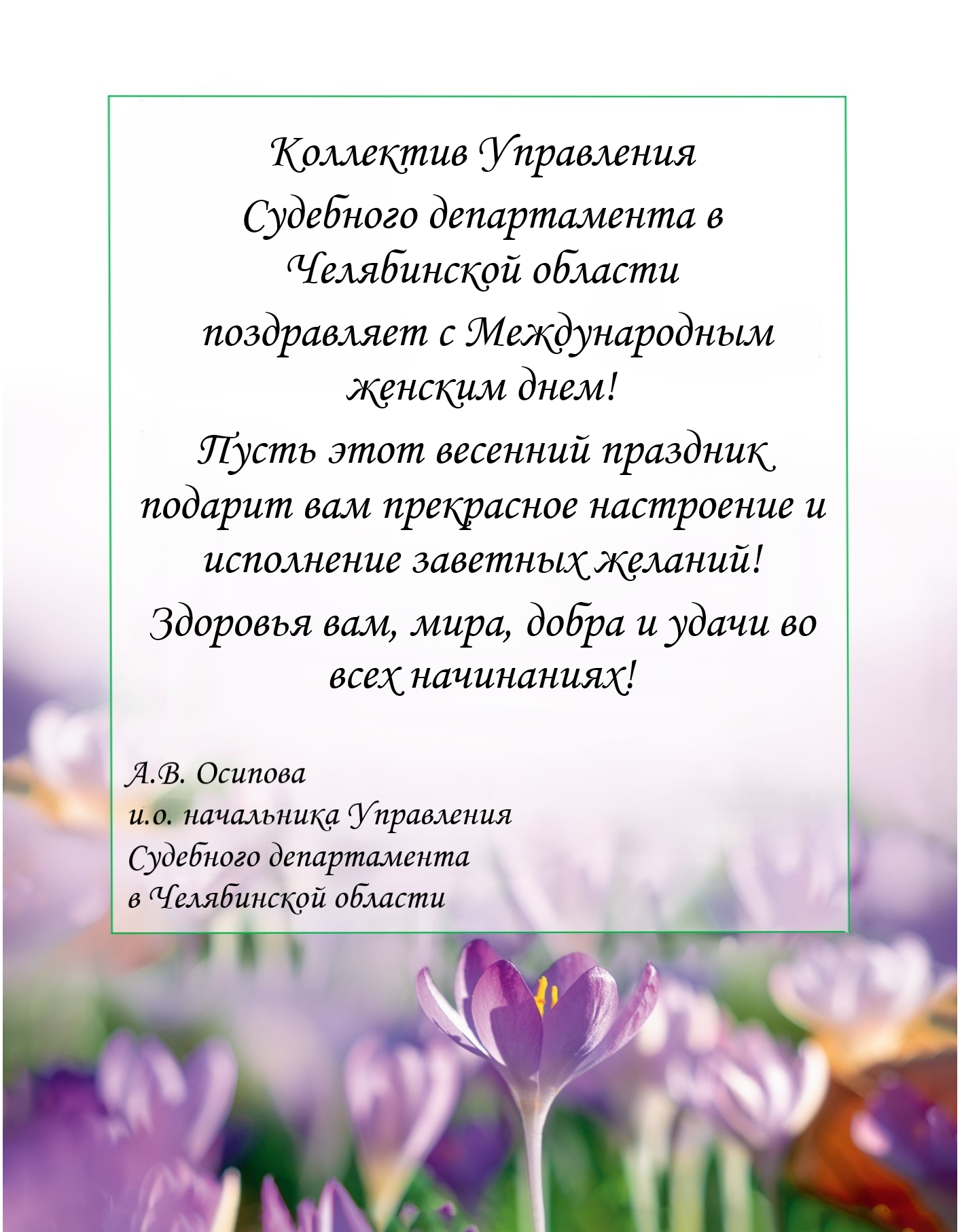 Коллектив Управления Судебного департамента в Челябинской области поздравляет с Международным женским днем!